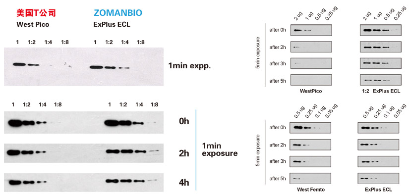 7. 該底物極其敏感,ExPlus ECL底物要求使用比大多數(shù)市售底物少得多的樣品、一抗、二抗,通常低至少10-20倍。