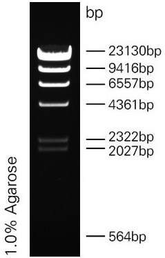 本產品是由λ DNA經HindIII完全酶切而成,適用于瓊脂糖凝膠電泳中DNA條帶的分析。產品中已含有1×loading buffer,可直接上樣,使用方便。8條帶的大小分別為125,564,2027,2322,4361,6557,9416,23130bp。