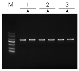 注解:三個月穩(wěn)定性實驗結(jié)果圖 柑橘內(nèi)參基因GAPDH 1kb擴增結(jié)果 RNA使用量為50 ng 1:4℃保存 2:37℃保存 3:-20℃保存 M:莊盟DL2000(3μl點樣) |