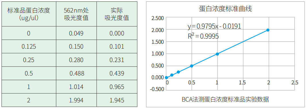 BCA(bicinchoninic acid)法蛋白濃度定量試劑盒是一種抗干擾能力強且準確定量的蛋白含量檢測試劑盒。眾所周知,二價銅離子在堿性的條件下,可以被蛋白質還原成一價銅離子(biuret reaction),一價銅離子和獨特的 BCA Solution A(含有 BCA)相互作用產生敏感的顏色反應。兩分子的 BCA 螯合一個銅離子,形成紫色的反應復合物。該水溶性的復合物在 562nm 處顯示強烈的吸光性,吸光度和蛋白濃度在廣泛范圍內有良好的線性關系,因此根據(jù)吸光值可以推算出蛋白濃度。