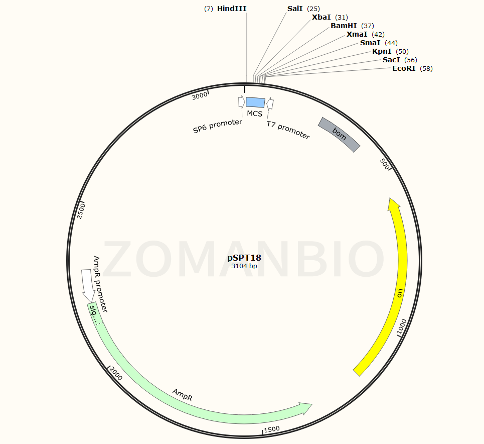 pSPT18是一個高拷貝質(zhì)粒,質(zhì)粒長度為3104bp,含有Amp青霉素抗性基因,復(fù)制子為pBR322 ori。