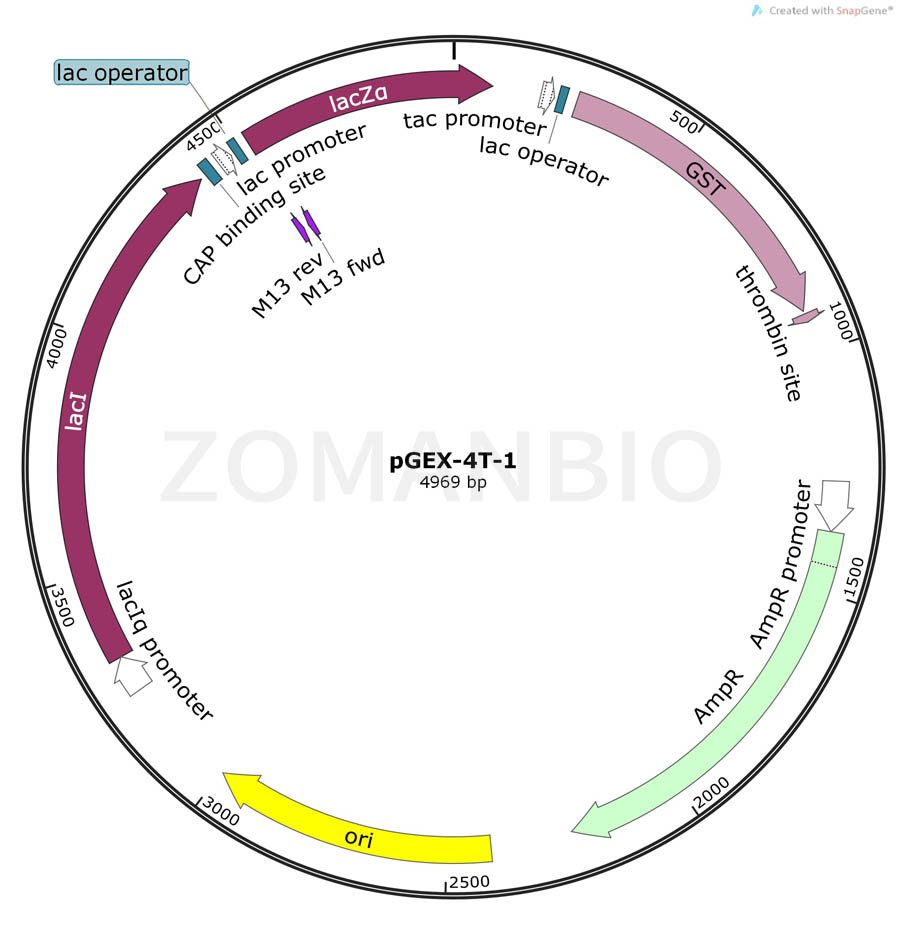 pGEX-4T-1質(zhì)粒是一個大腸桿菌表達載體,Tac強啟動子可以驅(qū)動GST促溶標(biāo)簽和目的基因融合表達,LacI阻礙蛋白和Laco操作子使本質(zhì)粒在沒有加入IPTG之前禁止表達,防止其影響細菌生長。表達后的融合蛋白可用凝血酶蛋白酶切割,再過一次GST柱子即可清除掉GST標(biāo)簽。 質(zhì)粒只保證關(guān)鍵序列正確,不保證表達效果。
