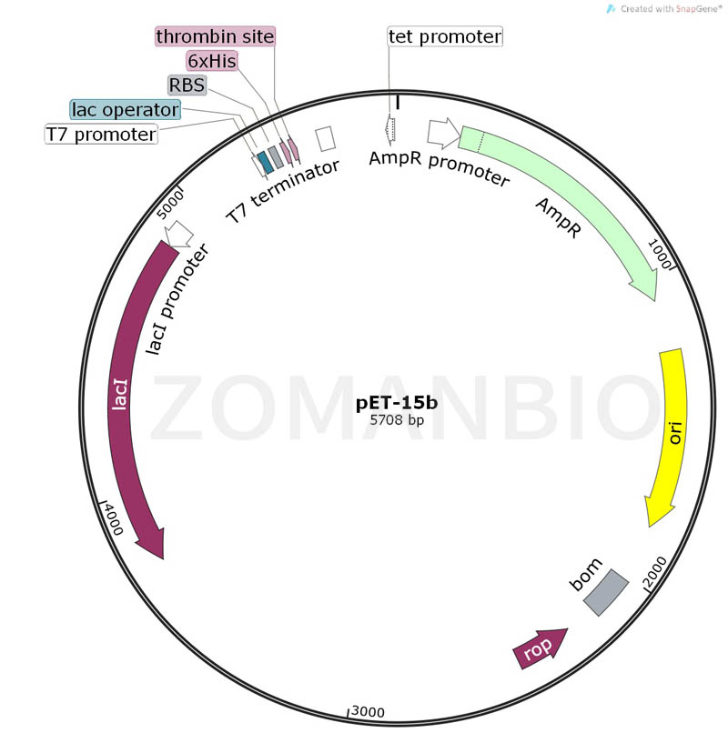 pET-15b質(zhì)粒是一種原核表達(dá)載體,含有一個N端的6×His標(biāo)簽、thrombin酶切位點(diǎn)和BamHI限制性內(nèi)切酶位點(diǎn)。表達(dá)由宿主細(xì)胞提供的T7 RNA聚合酶誘導(dǎo),目的基因被克隆到質(zhì)粒載體上,受噬菌體強(qiáng)轉(zhuǎn)錄及翻譯信號控制。pET系統(tǒng)是有史以來在大腸桿菌中表達(dá)重組蛋白的功能最強(qiáng)大的系統(tǒng),也是現(xiàn)今原核表達(dá)方面使用最廣泛的系統(tǒng)。該系列質(zhì)粒能很容易的通過降低誘導(dǎo)物的濃度來削弱蛋白表達(dá)。在非誘導(dǎo)條件下,可以使目的基因處于完全沉默狀態(tài)而不轉(zhuǎn)錄。The pET-15b vector carries an N-terminal His?Tag? sequence followed by a thrombin site and three cloning sites. Unique sites are shown on the circle map. Note that the sequence is numbered by the pBR322 convention, so the T7 expression region is reversed on the circular map. The cloning/expression region of the coding strand transcribed by T7 RNA polymerase is shown below.質(zhì)粒只保證關(guān)鍵序列正確,不保證表達(dá)效果。