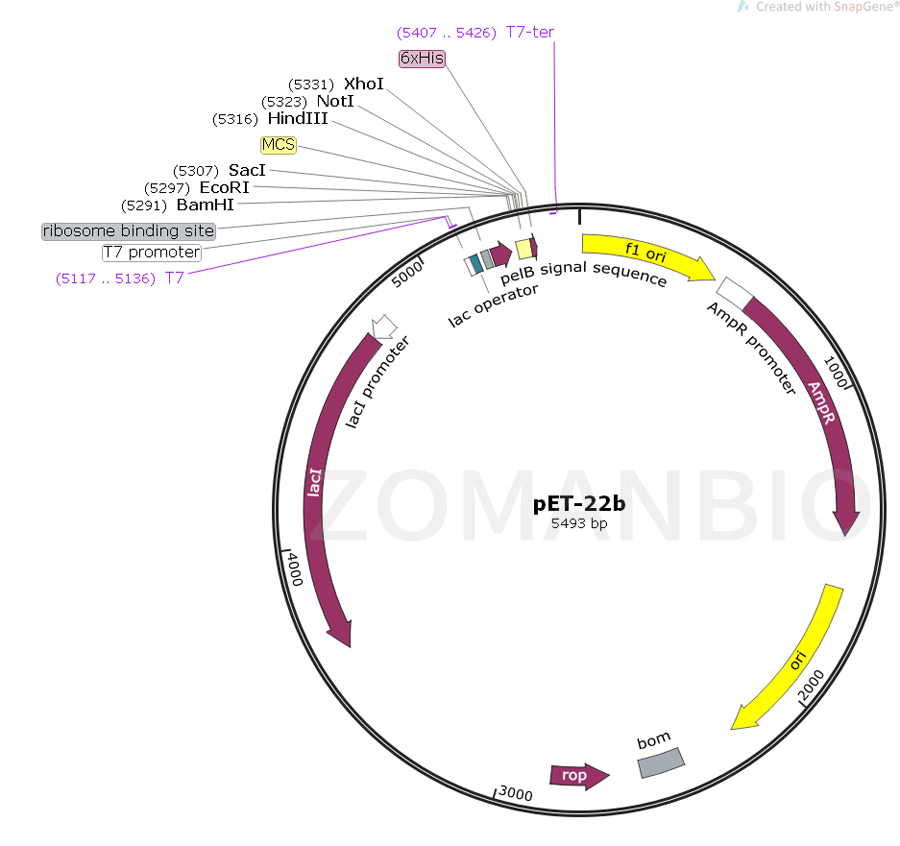 pET-22b質(zhì)粒是一種原核表達(dá)載體,N端含有一個(gè)pelB前導(dǎo)肽、C-端的His標(biāo)簽。該質(zhì)粒含有多個(gè)常用的酶切位點(diǎn),便于不同基因克隆。表達(dá)由宿主細(xì)胞提供的T7 RNA聚合酶誘導(dǎo),目的基因被克隆到質(zhì)粒載體上,受噬菌體強(qiáng)轉(zhuǎn)錄及翻譯信號控制。T7 RNA聚合酶啟動的克隆和表達(dá)區(qū)域在質(zhì)粒圖譜中也被標(biāo)注了出來。質(zhì)粒的F1復(fù)制子是被定向的,所以在T7噬菌體聚合酶的作用下,包含有蛋白編碼序列的病毒 粒子能夠產(chǎn)生,并啟動蛋白表達(dá),同時(shí)蛋白表達(dá)將被T7終止子序列的作用下終止蛋白翻譯。