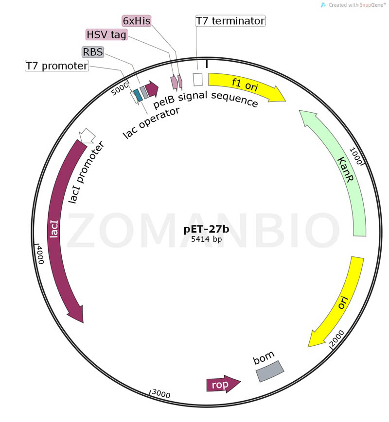 pET-27b質(zhì)粒是一種原核表達載體,C端含有一個6×His標簽、HSV標簽,N端含有一個pelB前導肽。該質(zhì)粒含有多個常用的酶切位點,便于不同基因克隆。表達由宿主細胞提供的T7 RNA聚合酶誘導,目的基因被克隆到質(zhì)粒載體上,受噬菌體強轉(zhuǎn)錄及翻譯信號控制。