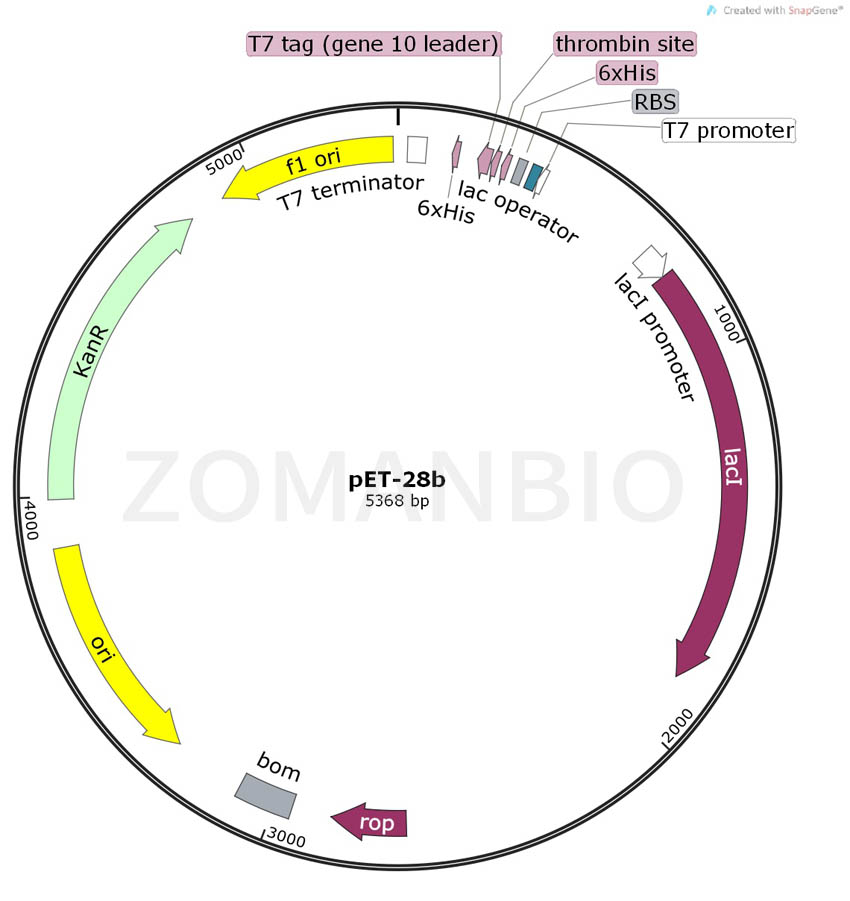 pET-28b載體帶有一個(gè)N端的His/Thrombin/T7蛋白標(biāo)簽,同時(shí)含有一個(gè)可以選擇的C端His標(biāo)簽。pET28b載體的單一的 多克隆位點(diǎn)見(jiàn)上面的環(huán)狀質(zhì)粒圖譜。注意:載體序列是以pBR322質(zhì)粒的編碼規(guī)矩進(jìn)行編碼的,所以T7蛋白表達(dá)區(qū)在質(zhì)粒圖譜上面是反向的。T7 RNA聚合酶啟動(dòng)的克隆和表達(dá)區(qū)域在質(zhì)粒圖譜中也被標(biāo)注了出來(lái)。質(zhì)粒的F1復(fù)制子是被定向的,所以在T7噬菌體聚合酶的作用下,包含有蛋白編碼序列的病毒 粒子能夠產(chǎn)生,并啟動(dòng)蛋白表達(dá),同時(shí)蛋白表達(dá)將被T7終止子序列的作用下終止蛋白翻譯。質(zhì)粒只保證關(guān)鍵序列正確,不保證表達(dá)效果。
