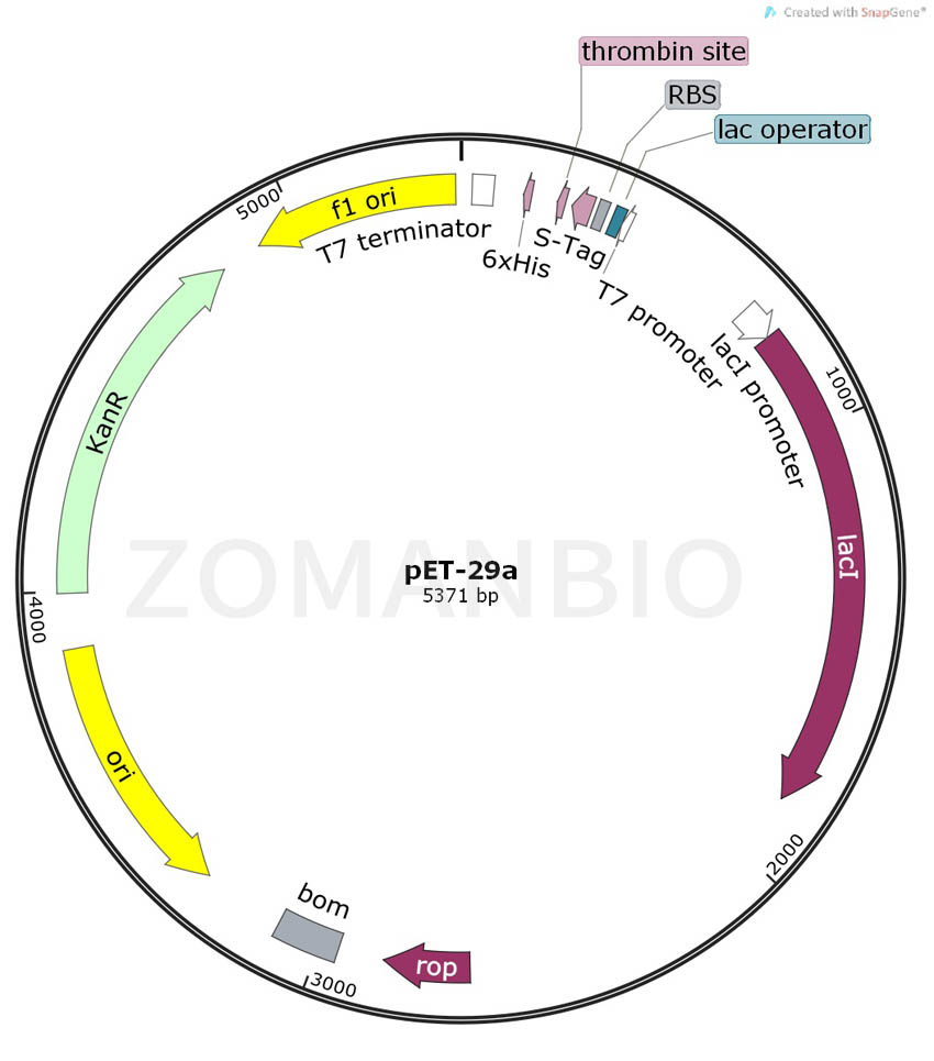 pET-29a質(zhì)粒是一種原核表達載體,C端含有一個6×His標簽,N端含有一個thrombin位點和S標簽。該質(zhì)粒含有多個常用的酶切位點,便于不同基因克隆。表達由宿主細胞提供的T7 RNA聚合酶誘導,目的基因被克隆到質(zhì)粒載體上,受噬菌體強轉(zhuǎn)錄及翻譯信號控制。