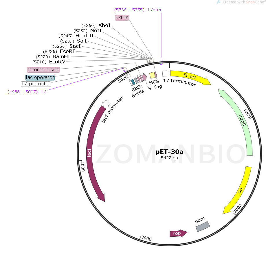 pET-30a質(zhì)粒是一種原核表達(dá)載體,C端含有一個(gè)6×His affinity標(biāo)簽,N端含有一個(gè)thrombin位點(diǎn)、6×His affinity標(biāo)簽、EK標(biāo)簽和S標(biāo)簽。該質(zhì)粒含有多個(gè)常用的酶切位點(diǎn),便于不同基因克隆。表達(dá)由宿主細(xì)胞提供的T7 RNA聚合酶誘導(dǎo),目的基因被克隆到質(zhì)粒載體上,受噬菌體強(qiáng)轉(zhuǎn)錄及翻譯信號(hào)控制。