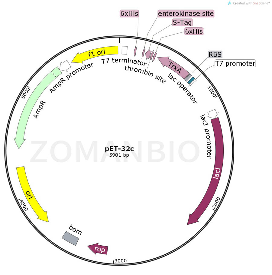 pET-32C質粒是一個大腸桿菌表達載體,T7啟動子驅動TrxA促溶標簽和目的蛋白融合表達。