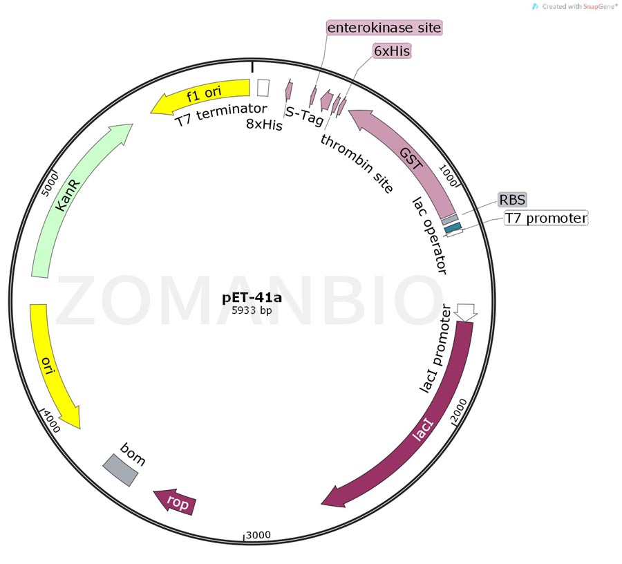 T7 RNA聚合酶啟動(dòng)的克隆和表達(dá)區(qū)域在質(zhì)粒圖譜中也被標(biāo)注了出來。質(zhì)粒的F1復(fù)制子是被定向的,所以在T7噬菌體聚合酶的作用下,包含有蛋白編碼序列的病毒 粒子能夠產(chǎn)生,并啟動(dòng)蛋白表達(dá),同時(shí)蛋白表達(dá)將被T7終止子序列的作用下終止蛋白翻譯。pET-41a載體上面含有一個(gè)EK蛋白酶切位點(diǎn),當(dāng)將目的基因使用載體上面的PshAI限制性內(nèi)切酶位點(diǎn)插入進(jìn)去時(shí),可以通過EK蛋白酶將載體上的融合的所有氨基酸序列包括GST標(biāo)簽序列,全部切除掉。
