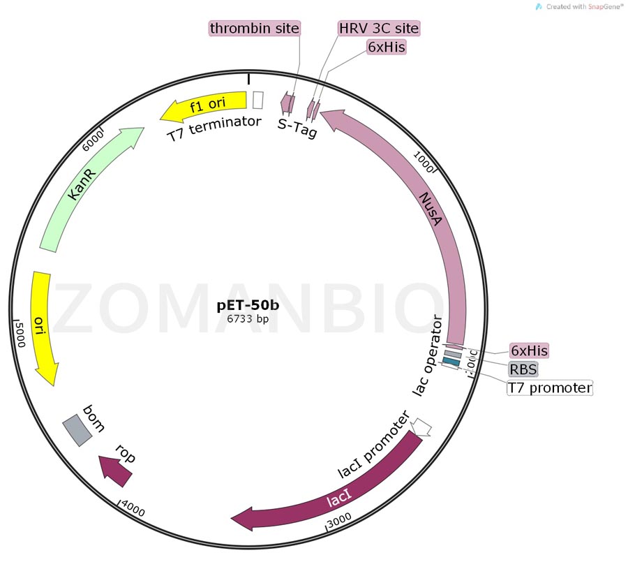 pET50b載體攜帶有N端的Nus標(biāo)簽和His純化標(biāo)簽,緊跟著這些標(biāo)簽的有一個(gè)HRV3C蛋白酶切位點(diǎn)。這個(gè)HRV3C蛋白酶切位點(diǎn)能夠特異性的高效切割 “LEVLFQ↓GP”氨基酸序列,酶活力在低溫下很強(qiáng)。pET-50b(+)載體上還含有一個(gè)可選擇的C端Thrombin蛋白酶切位點(diǎn)和S標(biāo)簽序列。