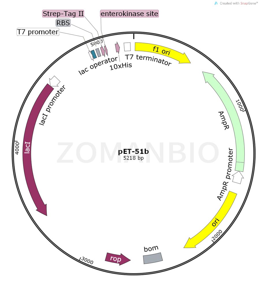pET-51b是一個大腸桿菌pET系列表達(dá)質(zhì)粒。The pET-51b(+) vector carries an N-terminal Strep?Tag II coding sequence (1) followed by a rec-ognition site for enterokinase, and an optional C-terminal His?Tag coding sequence. The presence of two "gentle elution" tags at both the N-terminus and C-terminus is ideal for dual puri?cation strate-gies designed to isolate full-length fusion proteins (2). Unique restriction sites are shown on the circle map. Note that the sequence is numbered by the pBR322 convention, so the T7 expression region is reversed on the circle map. The cloning/expression region of the coding strand transcribed by T7 RNA polymerase is shown below the circle map. The f1 origin is oriented so that infection with the helper phage will produce virions containing single-stranded DNA that corresponds to the coding strand.