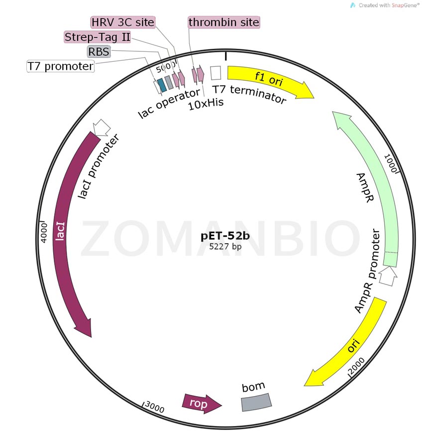 The pET-52b(+) vector carries an N-terminal Strep?Tag? II coding sequence (1) followed by a recognition site for the human rhinovirus (HRV) 3C protease. This protease is highly specific for cleavage of the sequence LEVLFQ↓GP (2), and is active at low temperatures (3). The multiple cloning region is followed by an optional thrombin recognition site and a C-terminal His?Tag? coding sequence. The presence of two “gentle elution" tags at both the N-terminus and C-terminus is ideal for dual purification strategies designed to isolate full-length fusion proteins (4). Unique restriction sites are shown on the circle map. Note that the sequence is numbered by the pBR322 convention, so the T7 expression region is reversed on the circle map. The cloning/expression region of the coding strand transcribed by T7 RNA polymerase is shown below the circle map. The f1 origin is oriented so that infection with the helper phage will produce virions containing single-stranded DNA that corresponds to the coding strand.