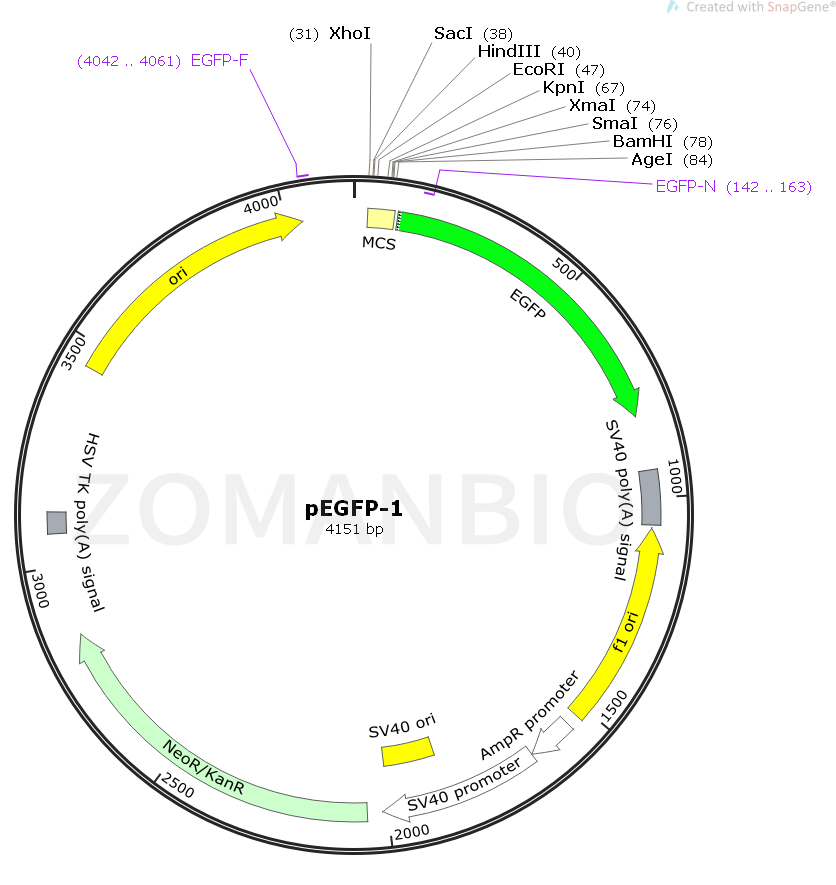 pEGFP-1編碼野生型GFP(1-3)的紅移型變體,其已經(jīng)針對更明亮的熒光和哺乳動物細(xì)胞中更高的表達(dá)進(jìn)行了優(yōu)化。(激發(fā)最大值= 488nm;發(fā)射最大值= 507nm)pEGFP-1骨架還提供了用于在大腸桿菌中繁殖的pUC起始點和用于單鏈DNA生產(chǎn)的f1起源。