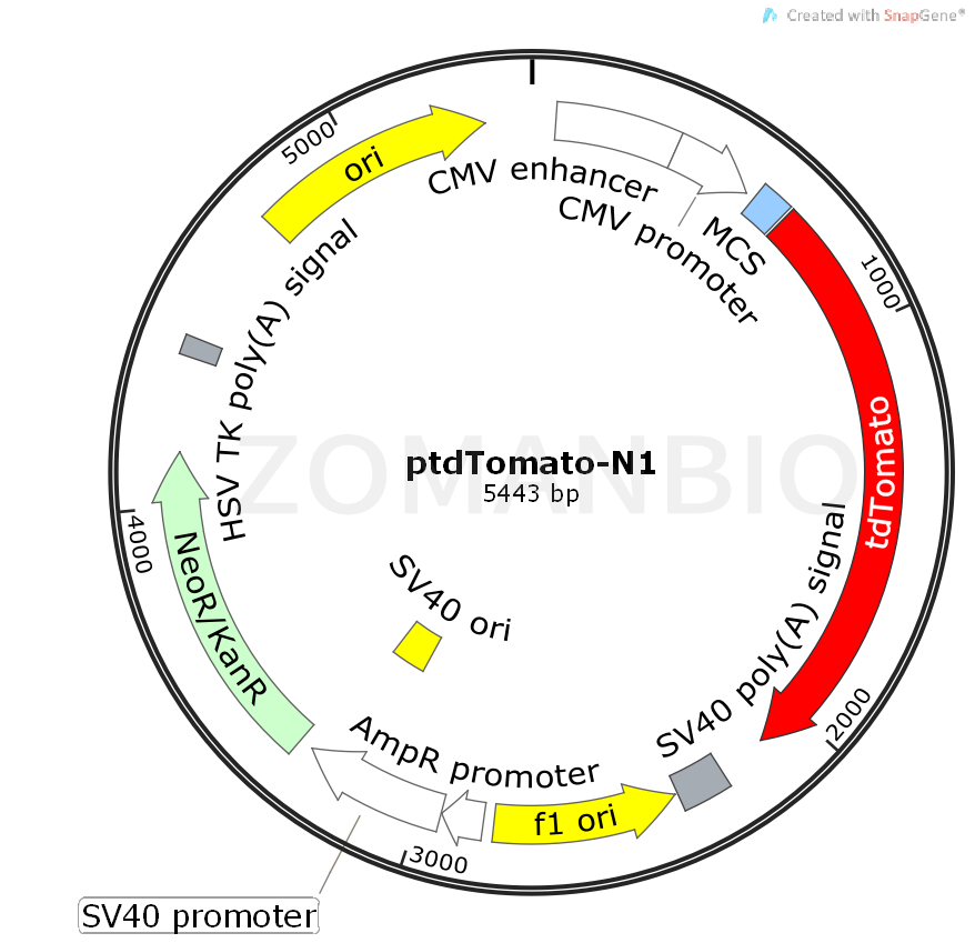 ptdTomato-N1 is a mammalian expression vector designed to express a protein of interest fused to the N-terminus of tdTomato. td Tomato is a member of the family of fruit fluorescent proteins (1) derived from the Discosoma sp. red fluorescent protein, DsRed (2). Because the Tomato protein has a tendency to dimerize, the vector was designed with two copies of the Tomato coding region linked together to allow intramolecular dimerization. As a result, each tdTomato RNA transcript encodes a tandem dimer of the Tomato protein (excitation and emission maxima equal 554nm and 581nm, respectively). Expression of td Tomato as a tandem dimer prevents the fused protein of interest from being forced into a dimeric complex. Fusions that retain the fluorescence properties of tdTomato can be monitored by flow cytometry and localized by fluorescence microscopy. The multiple cloning site (MCS) in ptdTomato-N1 is positioned upstream of the tdTomato coding sequence. A Kozak consensus sequence, located between the MCS and the tdTomato coding sequence, enhances translational efficiency of the unfused tdTomato protein in eukaryotic cells (3). SV40 polyadenylation signals downstream of the tdTomato coding sequence direct proper processing of the 3' end of the tdTomato (or fusion gene) mRNA.