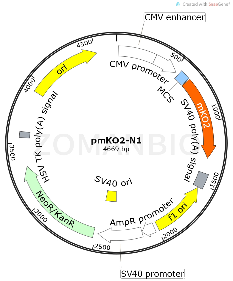 MKO2 is monomeric Kusabira-Orange 2 fluorescent protein, orange fluorescent gene, the Excitation excitation wavelength is 551nm, emission wavelength of Emission is 565nm, and the exogenous gene together, to detect whether the expression.