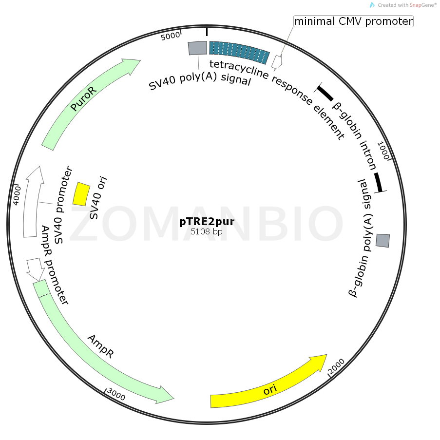 pTRE2pur is a response plasmid that expresses a gene of interest (Gene X) in Clontech's Tet-On? and Tet-Off? Gene Expression Systems and Tet-On and Tet-Off Cell Lines (1). The Tet Expression Systems and Cell Lines give researchers ready access to the tetracycline-regulated expression systems described by Gossen & Bujard (2; Tet-Off) and Gossen et al. (3; Tet-On).pTRE2pur contains an MCS immediately downstream of the Tet-responsive PhCMV*-1 promoter. cDNAs or genes inserted into the MCS will be responsive to the tTA and rtTA regulatory proteins in the Tet-Off and Tet-On systems, respectively. PhCMV*-1 contains the Tet response element (TRE), which consists of seven copies of the 19-bp tet operator sequence (tetO). TheTRE element is just upstream of the minimal CMV promoter (Pmin CMV), which lacks the enhancer that is part of the complete CMV promoter. Consequently, PhCMV*-1 is silent in the absence of binding of TetR or rTetR to the tetO sequences. Note that the cloned insert must have an initiation codon. In some cases the addition of a Kozak consensus ribosome binding site (4) may improve expression levels; however, many cDNAs have been efficiently expressed in Tet systems without the addition of a Kozak sequence. The puromycin resistance gene is used to directly select for stable transformants.