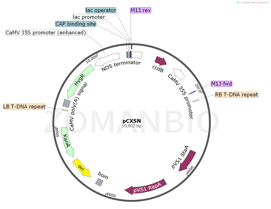pCXSN質粒是一個植物過表達載體,用Xcm I 酶切后變成T載體,連入基因后可直接轉化。其參考文獻是A versatile zero background T-vector system for gene cloning and functional genomics.