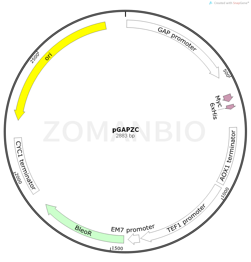 pGAPZ A,B,和C載體(2.9 KB)和pGAPZα,B,和C(3.1 KB)載體使用GAP啟動子在畢赤酵母中穩(wěn)定表達(dá)重組蛋白。重組蛋白表達(dá)為為帶有C-末端myc抗原表位和C端His標(biāo)簽的融合蛋白。此外,pGAPZα表達(dá)的融合蛋白在N-端帶有釀酒酵母(Saccharomyces cerevisiae)的α-因子分泌信號肽。這兩個系列的載體都提供三個不同讀碼框的載體,以方便克隆的帶有C-端標(biāo)簽和/或N-末端分泌信號肽的載體中。這些載體是基于顯性選擇標(biāo)記,Zeocin(博萊霉素)的篩選標(biāo)記可以同時使用于畢赤酵母和大腸桿菌。