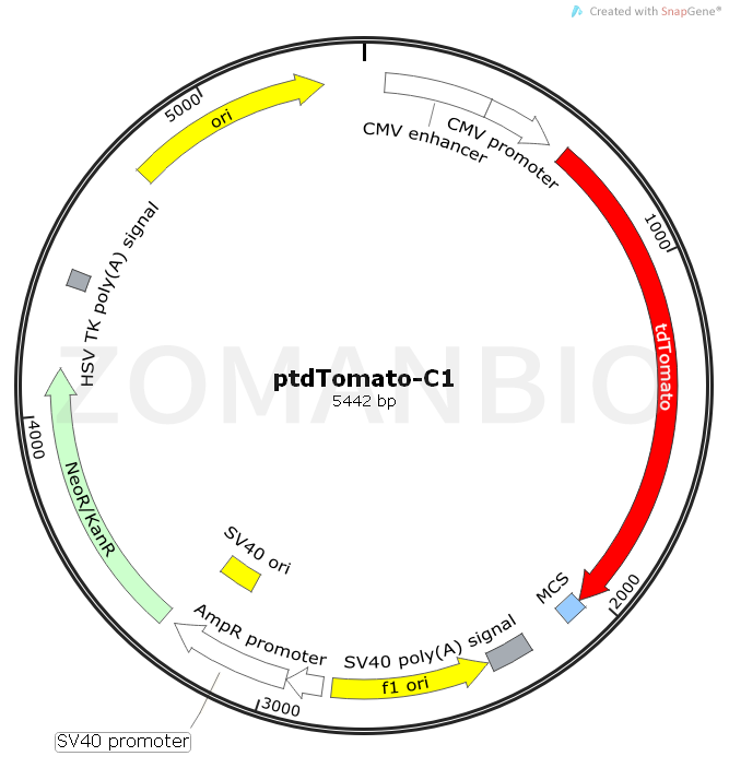 ptdTomato-C1 is a mammalian expression vector designed to express a protein of interest fused to the C-terminus of tdTomato. td Tomato is a member of the family of fruit fluorescent proteins (1) derived from the Discosoma sp. red fluorescent protein, DsRed (2). Because the Tomato protein has a tendency to dimerize, the vector was designed with two copies of the Tomato coding region linked together to allow intramolecular dimerization. As a result, each tdTomato RNA transcript encodes a tandem dimer of the Tomato protein (excitation and emission maxima equal 554nm and 581nm, respectively). Expression of td Tomato as a tandem dimer prevents the fused protein of interest from being forced into a dimeric complex. Fusions that retain the fluorescence properties of tdTomato can be monitored by flow cytometry and localized by fluorescence microscopy. The multiple cloning site (MCS) in ptdTomato-C1 is positioned downstream of the tdTomato coding sequence. A Kozak consensus sequence, located immediately upstream of the tdTomato coding sequence, enhances translational efficiency in eukaryotic cells (3). SV40 polyadenylation signals downstream of the tdTomato coding sequence and the MCS direct proper processing of the 3' end of the tdTomato (or fusion gene) mRNA. The vector backbone contains an SV40 origin for replication in mammalian cells expressing the SV40 large T antigen, a pUC origin of replication for propagation in E. coli, and an f1 origin for single-stranded DNA production. This vector also has a neomycin resistance cassette (Neor) that allows G418 selection of stably transfected eukaryotic cells. This cassette consists of the SV40 early promoter, the Tn5 neomycin/kanamycin resistance gene, and polyadenylation signals from the herpes simplex virus thymidine kinase (HSV TK) gene. A bacterial promoter upstream of the cassette confers kanamycin resistance in E. Coli.