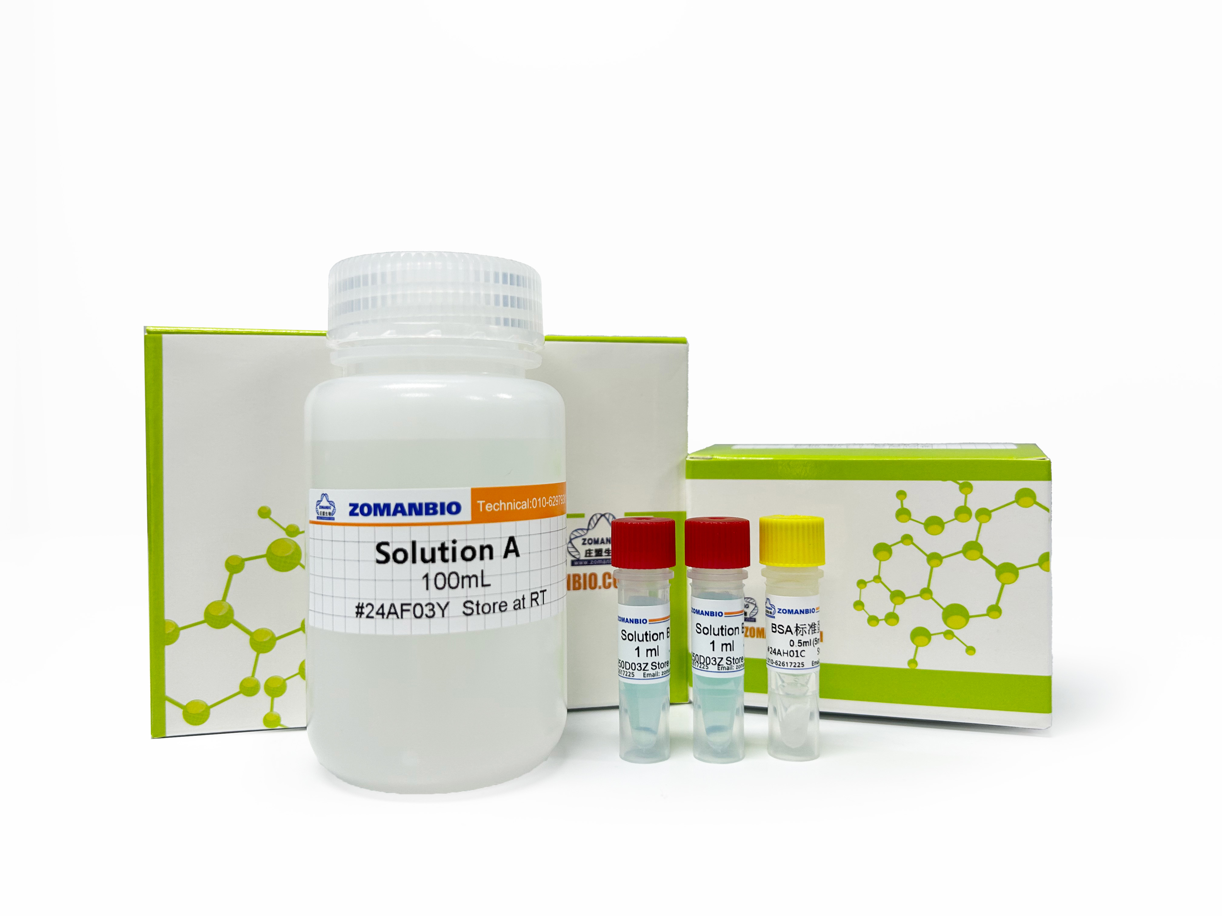 BCA(bicinchoninic acid)法蛋白濃度定量試劑盒是一種抗干擾能力強且準確定量的蛋白含量檢測試劑盒。眾所周知,二價銅離子在堿性的條件下,可以被蛋白質還原成一價銅離子(biuret reaction),一價銅離子和獨特的 BCA Solution A(含有 BCA)相互作用產生敏感的顏色反應。兩分子的 BCA 螯合一個銅離子,形成紫色的反應復合物。該水溶性的復合物在 562nm 處顯示強烈的吸光性,吸光度和蛋白濃度在廣泛范圍內有良好的線性關系,因此根據(jù)吸光值可以推算出蛋白濃度。