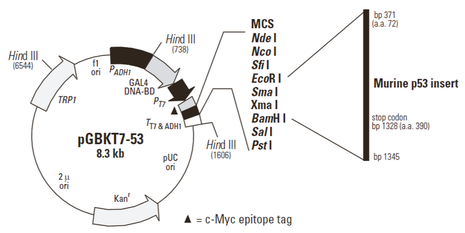 Yeast two-hybrid systems provide a sensitive method for detecting relatively weak and transient protein interactions. Such interactions may not be biochemically detectable, but may be critical for proper functioning of complex biological systems. pGBKT7-53 and pGADT7-T encode fusions between the GAL4 DNA-BD and AD and murine p53 and SV40 large T-antigen, respectively. p53 and large T-antigen interact in a yeast two-hybrid assay.