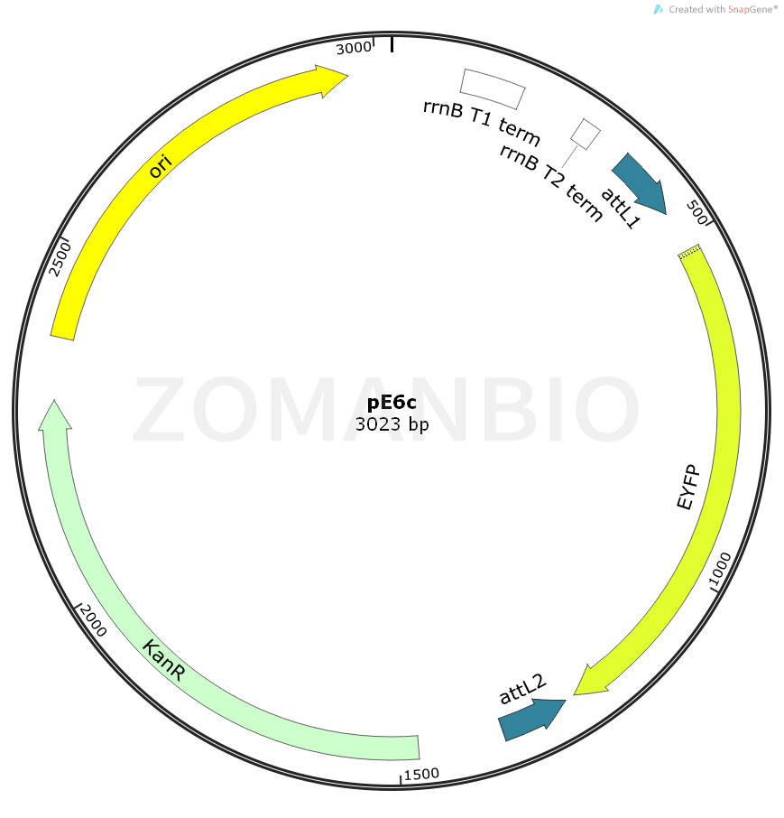 pE6c質(zhì)??梢詾镚ateWay反應(yīng)提供EYFP基因模板,還可以通過BamHI和NotI酶切位點連入目的基因,進(jìn)而和EYFP熒光基因一起導(dǎo)入到最終的表達(dá)載體,modified pENTR vector for C-terminal EYFP tag fusion with your gene of interest.