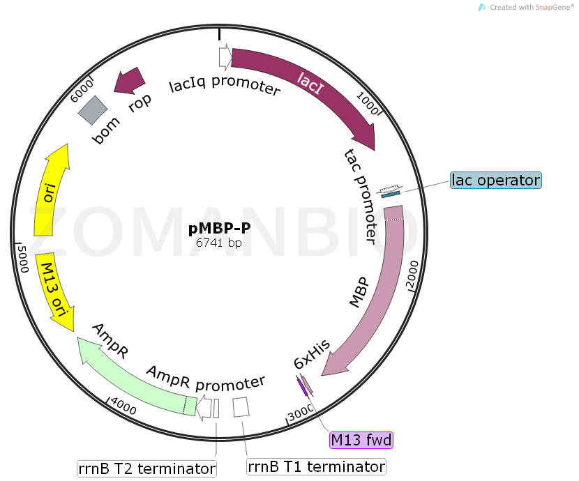 pMBP-P載體需要被IPTG誘導(dǎo)才能在BL21(DE3)中表達(dá),質(zhì)粒大小為6741bp,復(fù)制子是ColE1 ori,是一個高拷貝質(zhì)粒。