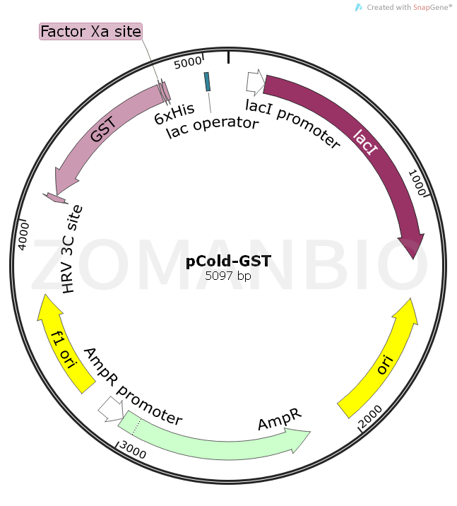 功能簡介:  | pCold-GST載體表達(dá)GST融合蛋白,GST標(biāo)簽可以提高目的蛋白的可溶性,提高目的蛋白的純度。  |