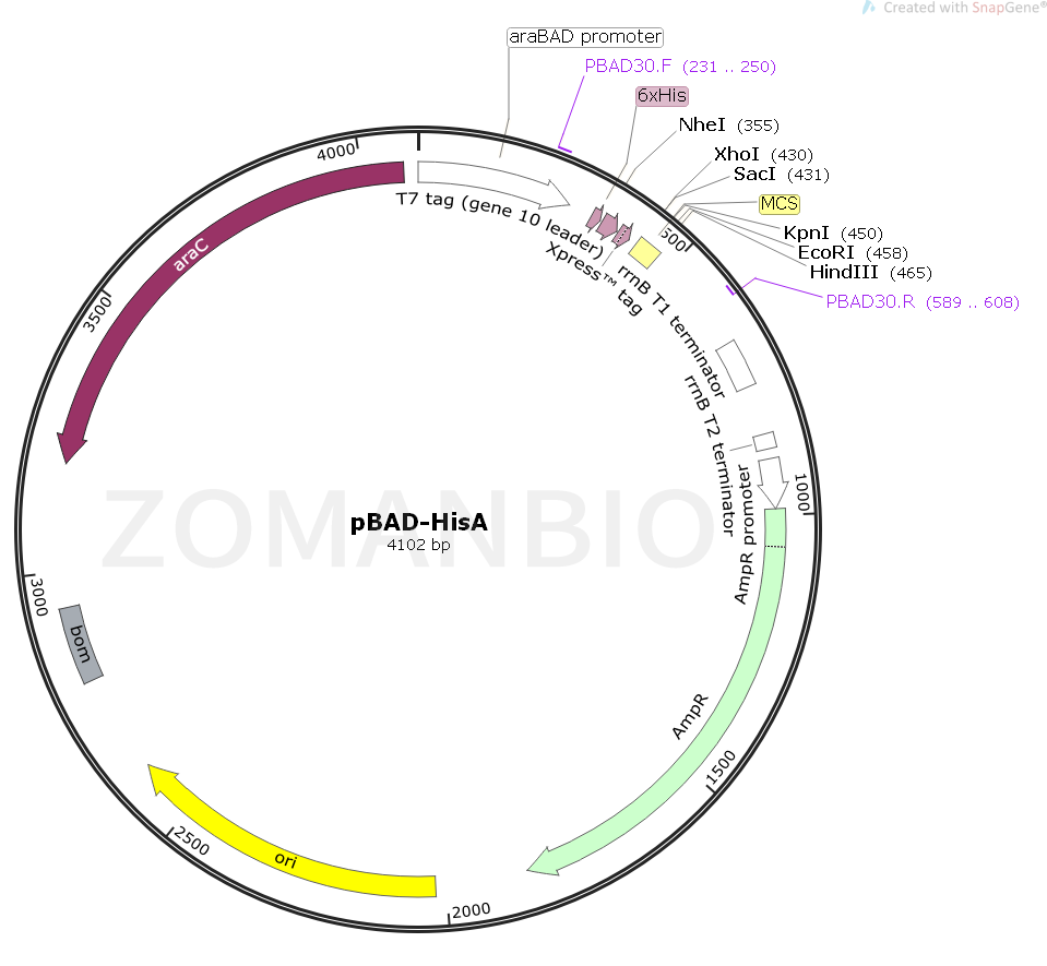 pBAD-HisA質(zhì)粒是衍生于pBR322載體。載體設(shè)計用來在大腸桿菌中進行可調(diào)節(jié),劑量依賴性的表達和純化重組目的蛋白。使大腸桿菌araBAD啟動子(pBAD)增強了大腸桿菌重組蛋白可溶性表達的水平。pBAD/His和pBAD/Myc His載體上的調(diào)節(jié)蛋白AraC能夠調(diào)控pBad啟動子。pBAD/Myc-His A 載體是阿拉伯糖調(diào)控載體;在無葡萄糖的培養(yǎng)基中,阿拉伯糖正向調(diào)控目的基因的表達;通過調(diào)節(jié)阿拉伯糖的濃度水平來優(yōu)化目的蛋白的可溶性表達。