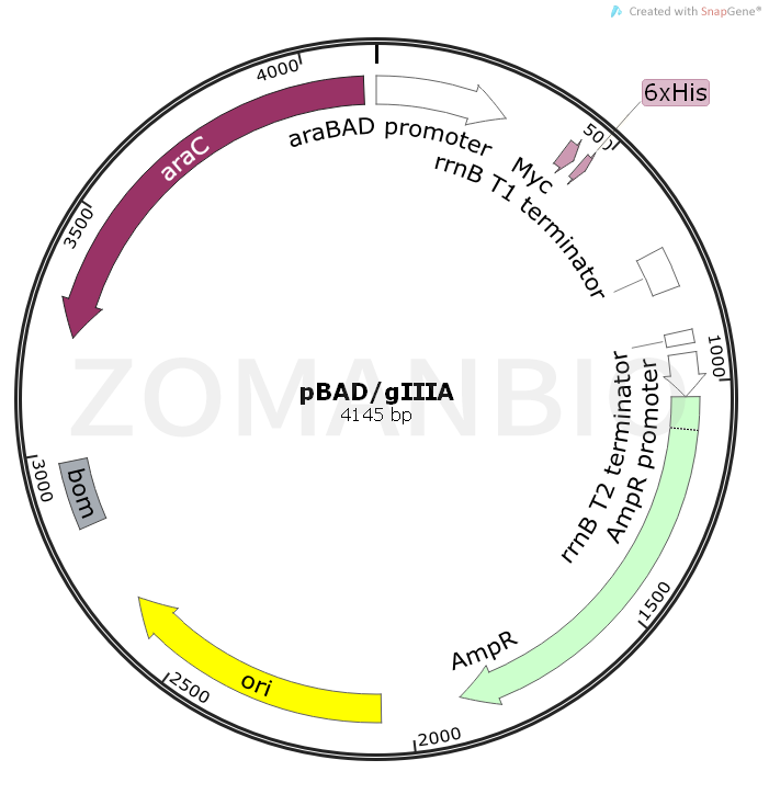 pBAD/gIII載體質(zhì)粒是衍生于pBR322載體。載體設(shè)計用來在大腸桿菌中進(jìn)行可調(diào)節(jié)分泌性表達(dá)和純化重組目的蛋白。使用基因III信號序列來定位重組蛋白,使其分泌到大腸桿菌周質(zhì)腔中。使用大腸桿菌araBAD啟動子(pBAD)增強(qiáng)了大腸桿菌重組蛋白可溶性表達(dá)的水平。載體上的調(diào)節(jié)蛋白AraC能夠調(diào)控pBad啟動子。