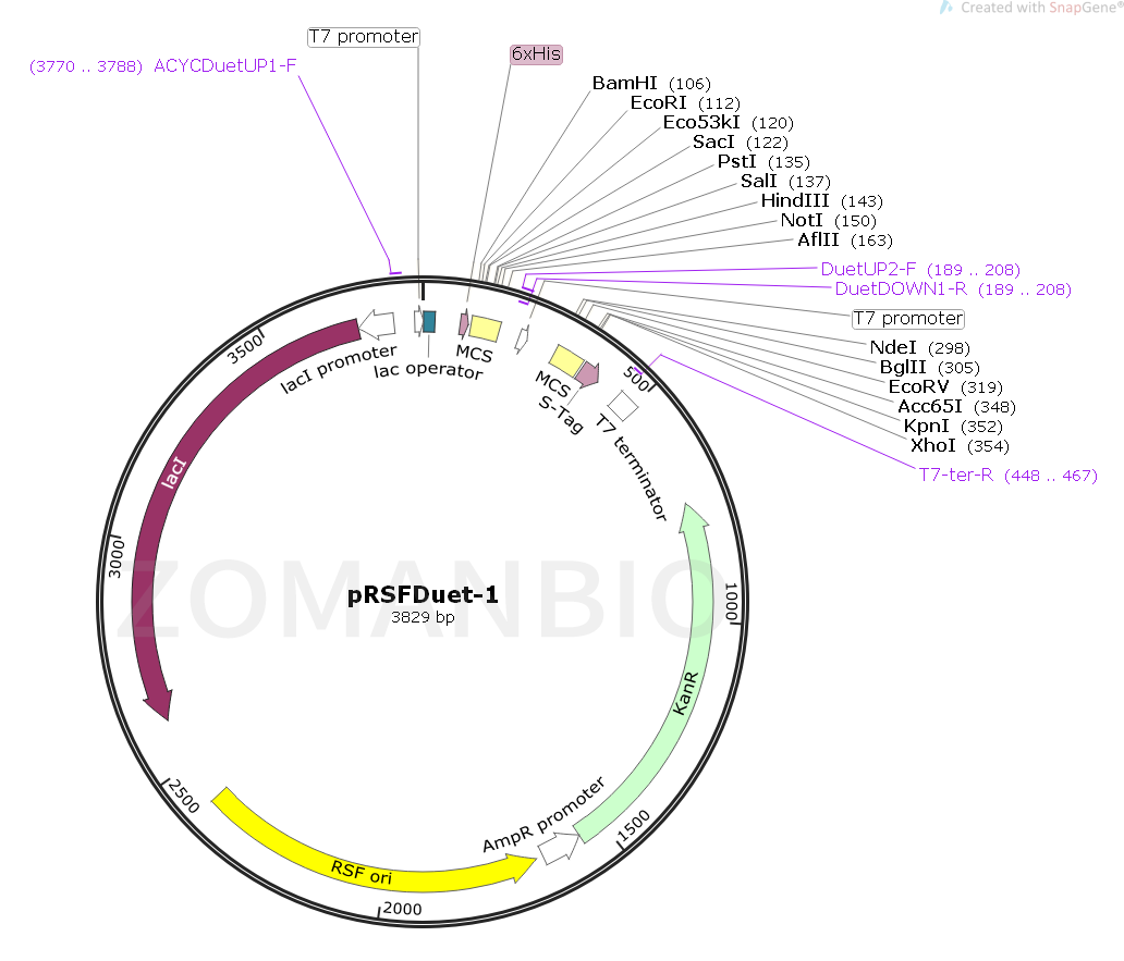 pRSFDuet-1質(zhì)粒是一種原核表達載體, N端含有一個6×His標(biāo)簽,C端含有一個S標(biāo)簽。該質(zhì)粒含有多個常用的酶切位點,便于不同基因克隆。表達由宿主細胞提供的T7 RNA聚合酶誘導(dǎo),目的基因被克隆到質(zhì)粒載體上,受噬菌體強轉(zhuǎn)錄及翻譯信號控制。