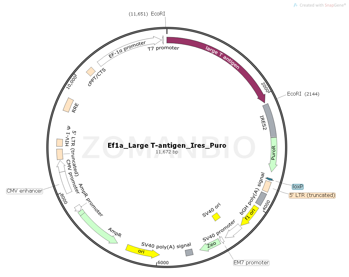 Ef1a_Large T-antigen_Ires_Puro是一個哺乳細胞慢病毒大T抗原表達質(zhì)粒。
