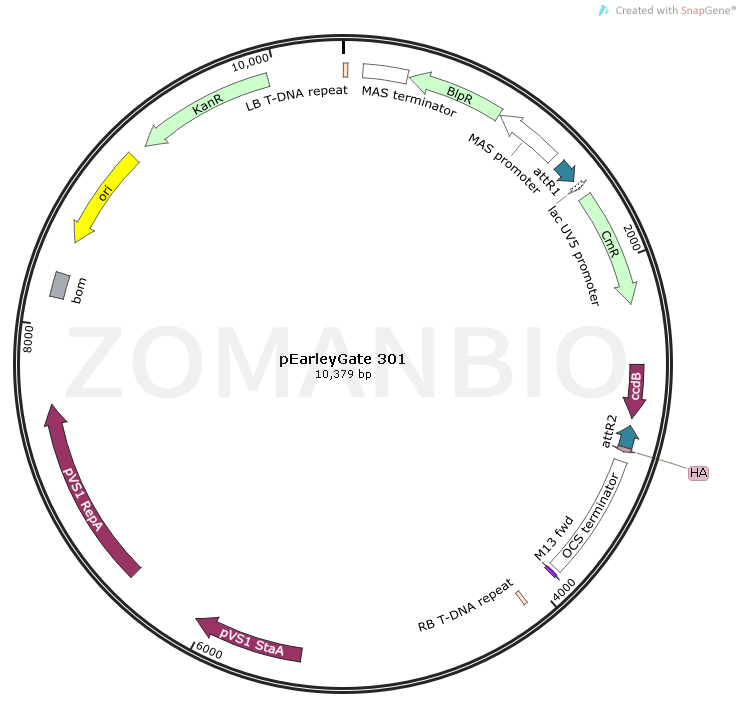 pEarleyGate 301(C-HA)是一個(gè)植物細(xì)胞Gateway系統(tǒng)表達(dá)質(zhì)粒。pEarleyGate 301 allows for rapid recombinational cloning of DNA from Gateway entry vectors to be epitope tagged with HA tag at the C-terminus of the encoded protein. This vector allows for expression of genes from a promoter of choice rather than from the enhanced 35S promoter (see pEarleyGate 101-105 or 201-204).